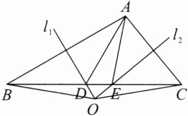 15. (2024·石家庄行唐县期中改编)如图,在$\triangle ABC$中,边$AB$的垂直平分线$l_1$交$BC$于点$D$,边$AC$的垂直平分线$l_2$交$BC$于点$E$,$l_1$与$l_2$相交于点$O$,连接$OB$,$OC$。若$\triangle ADE$的周长为$6\ cm$,$\triangle OBC$的周长为$14\ cm$。