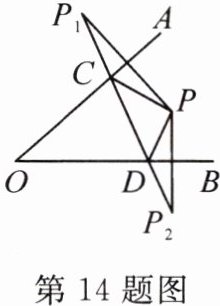 14. (本课时T12变式)如图,已知点$P$是$\angle AOB$内任意一点,点$P_1$,$P$关于$OA$对称,点$P_2$,$P$关于$OB$对称,连接$P_1P_2$,分别交$OA$,$OB$于点$C$,$D$,连接$PC$,$PD$。