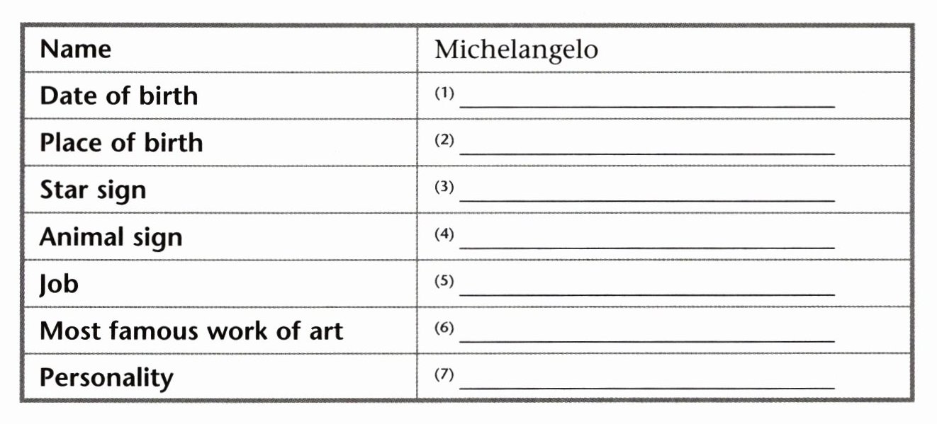 B2 Daniel is taking some notes about Michelangelo. Use the article on page 3 to help him complete the table.