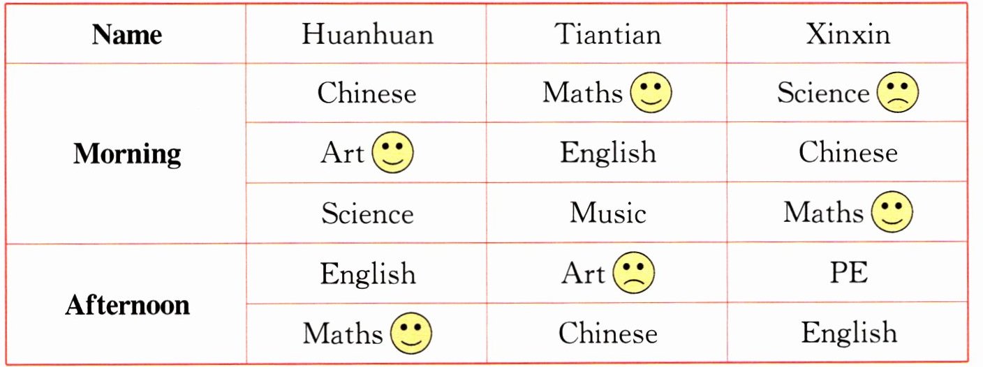二、欢欢、天天和欣欣也陆陆续续来到学校了,亮亮询问了他们对今天课程的喜好。根据亮亮整理的表格,选择正确的答案。