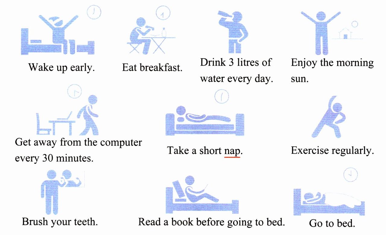 )3. The underlined word “nap” means “______” in Chinese.A. 沐浴