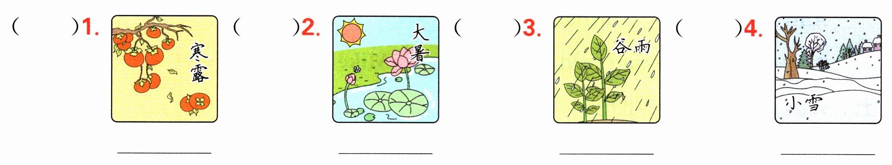 一、新趋势 传统文化 从方框中选出与下列节气图片对应的英文词组,并在横线上写出其所属季节的英文单词。
