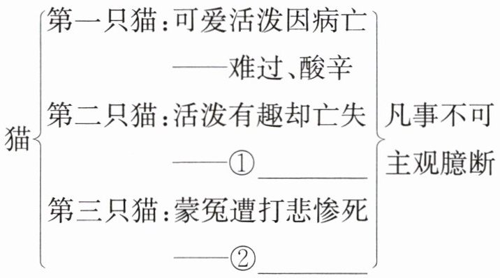 猫{第一只猫:可爱活泼因病亡——难过、酸辛第二只猫:活泼有趣却亡失——①______第三只猫:蒙冤遭打悲惨死——②______}凡事不可主观臆断