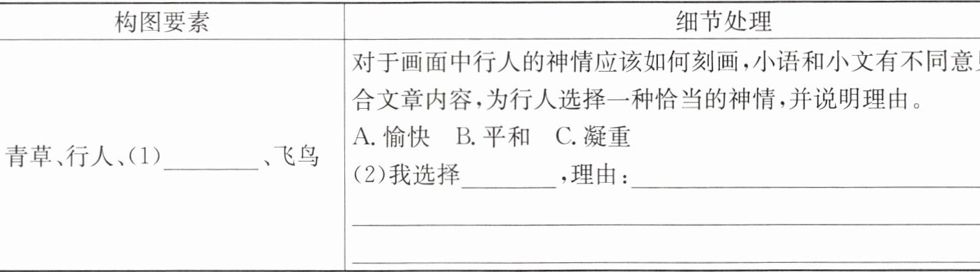 |青草、行人、(1) 、飞鸟|对于画面中行人的神情应该如何刻画,小语和小文有不同意见。请你结合文章内容,为行人选择一种恰当的神情,并说明理由。A. 愉快 B. 平和 C. 凝重(2)我选择 ,理由: |