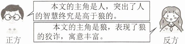 7.示例一:我同意正方的观点,本文的主角是人。(1分)整个故事都是围绕屠户展开的,从被狼追赶到杀死狼,全文写了屠户由惧怕狼到奋起自卫的过程。(1分)文章想要表现面对残暴的敌人,只有敢于斗争、善于斗争,才能取得胜利的主题。(2分) 示例二:我同意反方的观点,本文的主角是狼。(1分)狼是叙事的主线,在故事发展过程中起主导作用,屠户所有的行为都因狼而起。(1分)《狼》着力刻画了狼的贪婪、凶狠和狡诈,作者用狼来象征恶势力和贪得无厌的人。虽然文中也表现了屠户的机智果敢和斗争精神,但这是次要的。(2分)