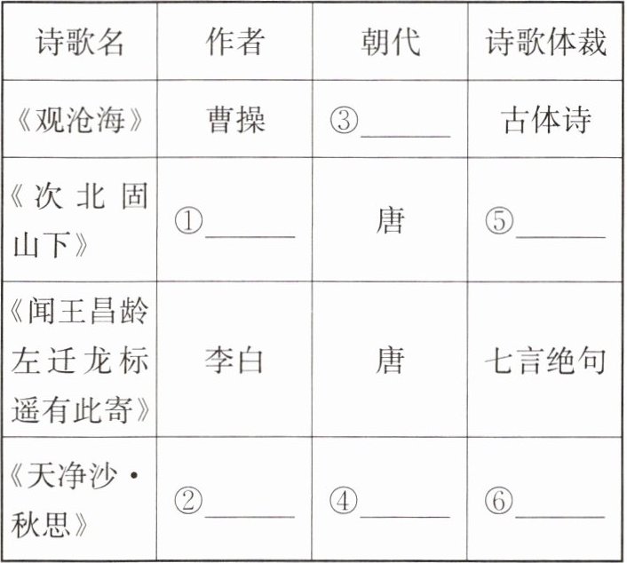 ①王湾 ②马致远 ③东汉末 ④元 ⑤五言律诗 ⑥小令