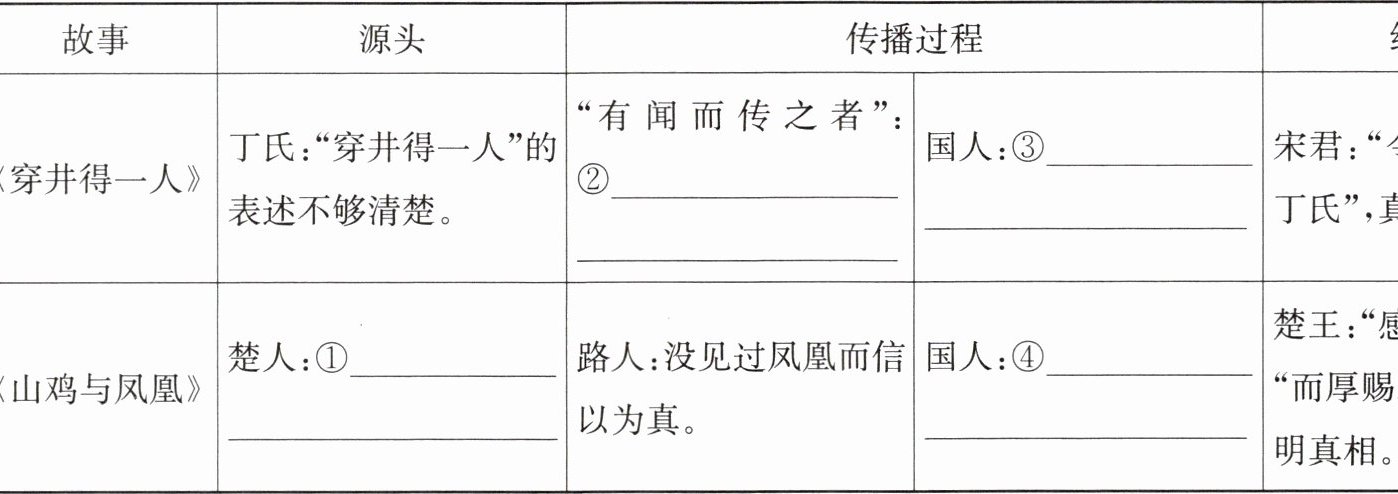 |《山鸡与凤凰》|楚人:① |路人:没见过凤凰而信以为真。国人:④ |楚王:“感其欲献己”“而厚赐之”,最终不明真相。|