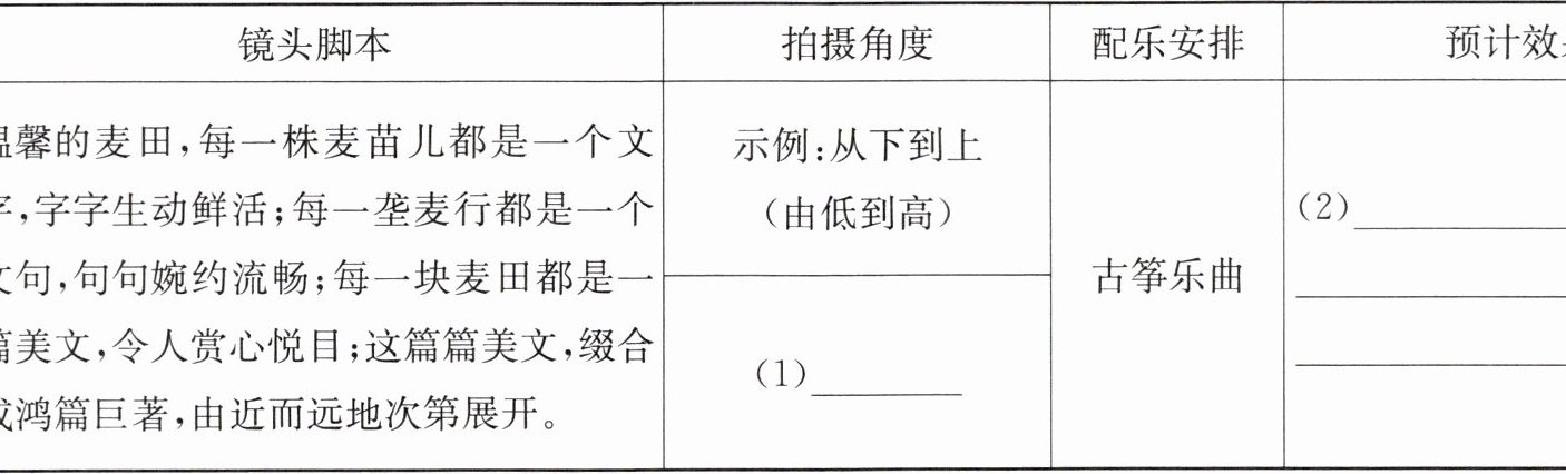 2. 【支架阅读】如果你跟随摄影组一起拍摄麦田的美景,请结合第⑥段画横线的句子完成下面的拍摄计划。(4分)