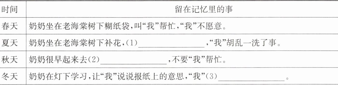 我发现:留在记忆里的事,看似琐碎却是作者对奶奶的独特记忆。春、夏、秋、冬,一幅一幅的生活图景有序展开。年年岁岁,(4) 见证了奶奶的一生,也寄寓了作者对奶奶的(5) 。