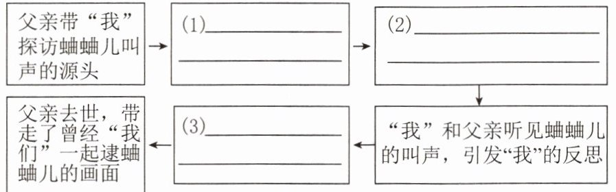 父亲带“我”探访蛐蛐儿叫声的源头→(1)______→(2)______→“我”和父亲听见蛐蛐儿的叫声,引发“我”的反思→(3)______→父亲去世,带走了曾经“我”们一起逮蛐蛐儿的画面