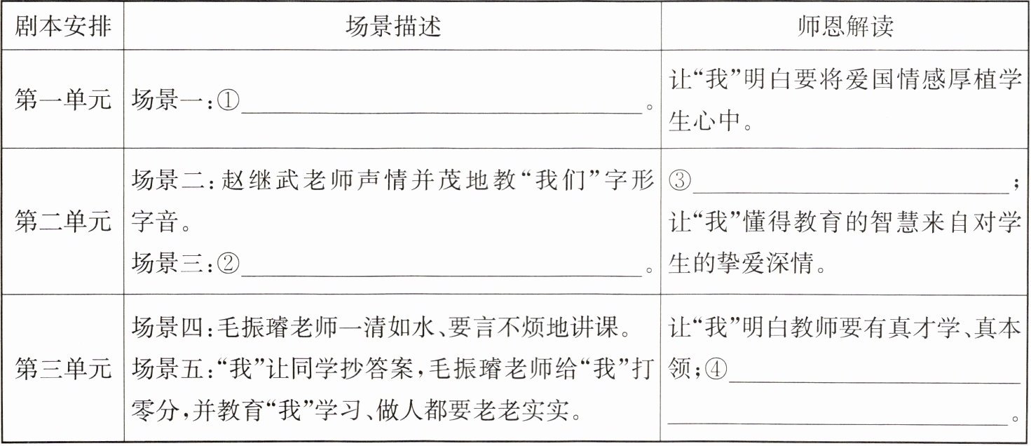 | 第三单元 | 场景四:毛振璿老师一清如水、要言不烦地讲课。场景五:“我”让同学抄答案,毛振璿老师给“我”打零分,并教育“我”学习、做人都要老老实实。 | 让“我”明白教师要有真才学、真本领;④______。 |