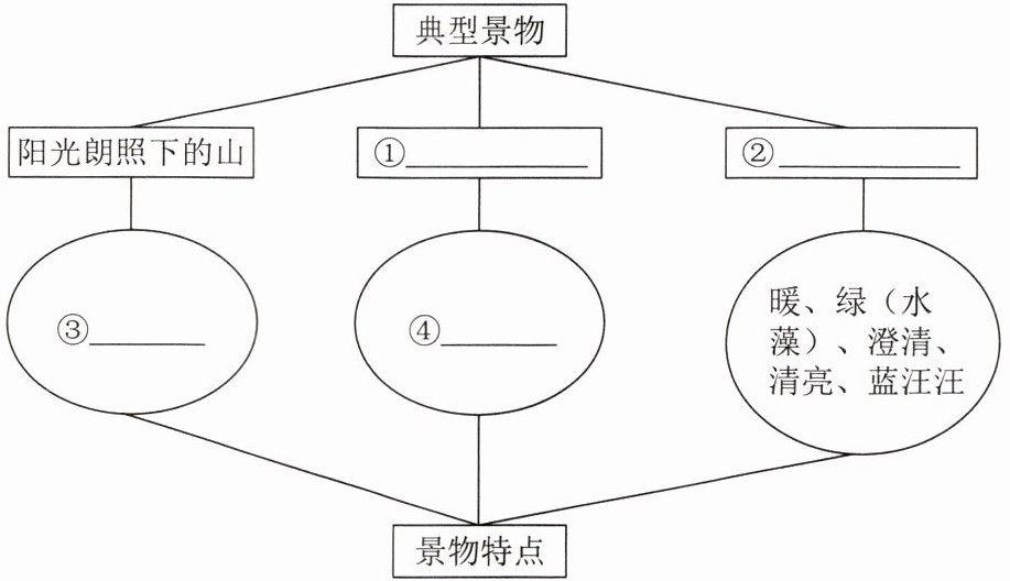 3. 【思维导图】【内容梳理】阅读写景散文要抓住文章选取的典型景物及其主要特点。下图是课文所描写的三个典型景物及其特点,请梳理课文内容,补全下图。(4 分)
