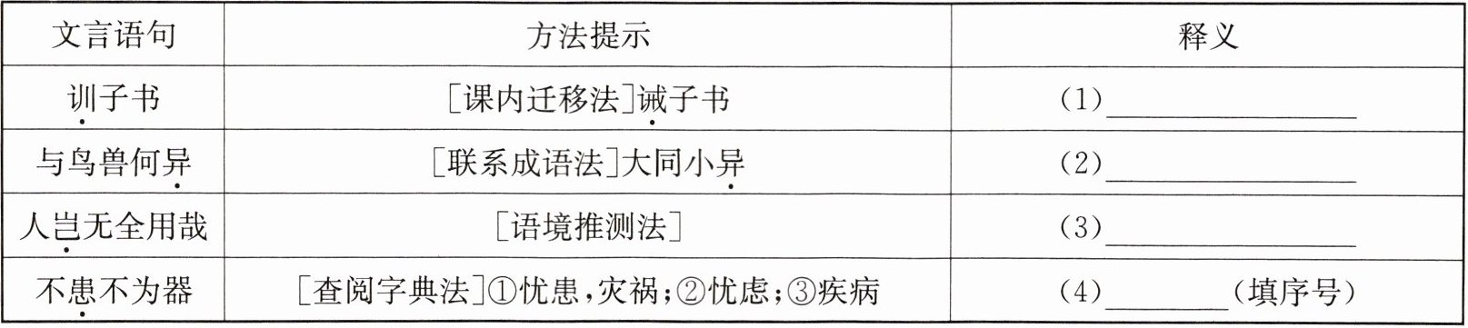 | 不患不为器 | [查阅字典法]①忧患,灾祸;②忧虑;③疾病 | (4)(填序号) |