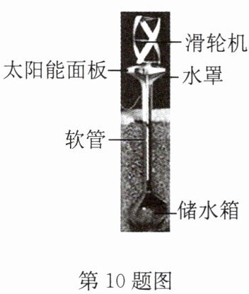 10. 如图所示是沙漠中的一种取水装置,先将装置埋进沙漠地下约2米的深处,利用太阳能面板发电,在自然风的作用下带动上方的叶片旋转,进而把地表上的空气通过软管抽入地下,在此过程中,受上层空气和下层土壤的温差影响,在水蒸气流入底部储水箱的过程中会凝结成小水珠,以此达到取水的效果.该装置能取到水的主要原因是( )