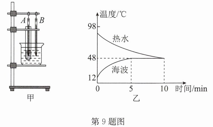 9. 如图甲是小明用水浴法探究海波熔化特点的实验装置,根据温度计A和B的示数绘制了海波和热水的温度随时间变化的图像,如图乙.下列说法正确的是( )