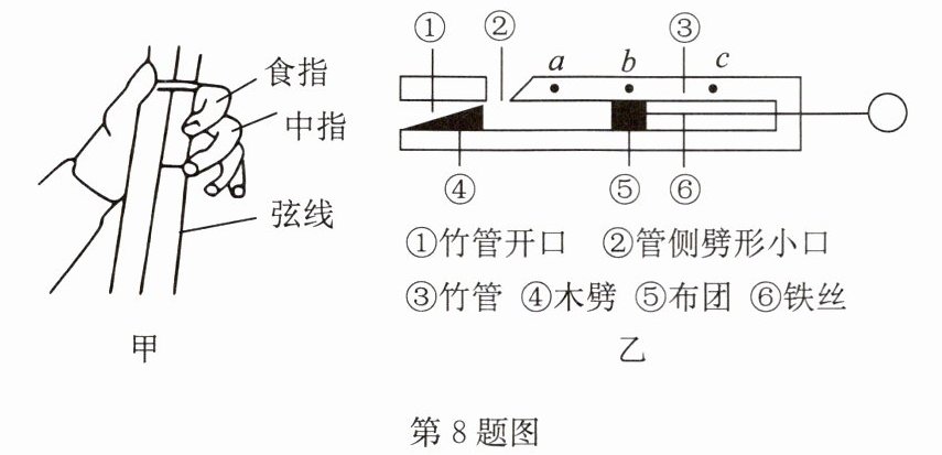 8.某同学在课余时自制了二胡和简易笛子.如图甲,演奏二胡时,手指在琴弦上来回移动,是通过改变______来改变音调的高低.如图乙,在笛子的竹管开口处向管内吹气,推拉铁丝时,音调改变,可以吹奏出乐曲.当布团分别位于a、b、c三个位置时,竹笛发声音调最高的位置是______.