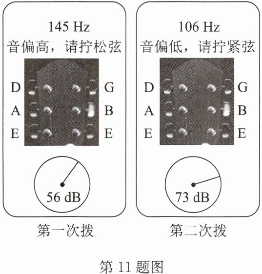 11.吉他在使用前需要通过调弦将音调调节标准.如图是前后两次用不同力度拨动同一根琴弦时,调音器的显示界面.结合所学知识可知( )