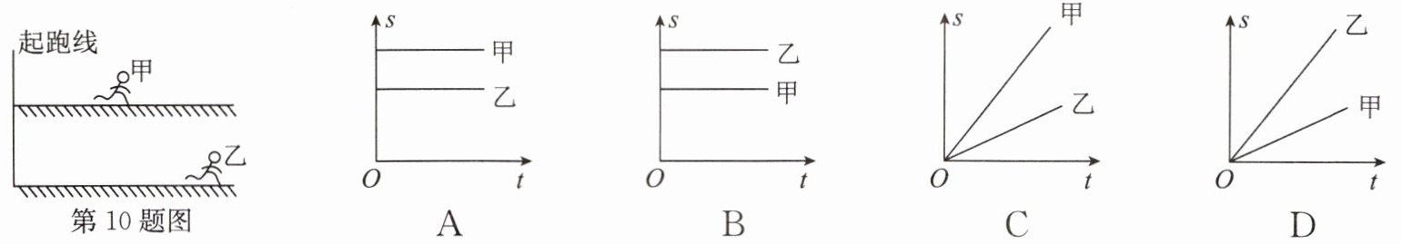 10.甲、乙两人同时从起跑线出发,同向做匀速直线运动,某时刻他们的位置如图所示,能正确反映两人运动距离与时间关系的是( )