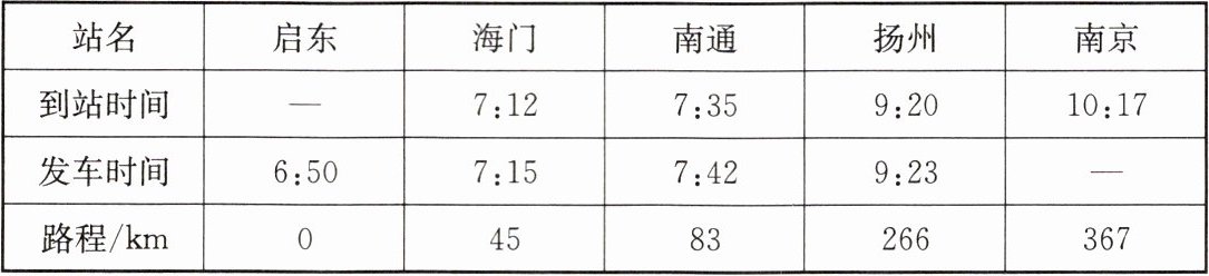 (2)由列车运行时刻表可知,海门到南通的路程$ s=83\mathrm{km}-45\mathrm{km}=38\mathrm{km} $,本次列车由海门到南通的平均速度$ v=\frac{s}{t}=\frac{38\mathrm{km}}{\frac{20}{60}\mathrm{h}}=114\mathrm{km/h} $.