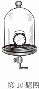 10. 如图所示,把正在响铃的闹钟放在玻璃罩内的泡沫塑料上,用抽气筒逐渐抽出其中的空气,注意声音的变化,再让空气逐渐进入玻璃罩,注意声音的变化.
