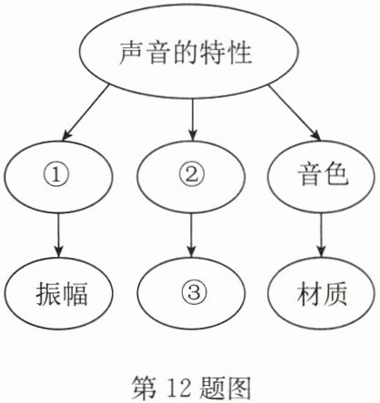 12. 归纳总结知识的方法是多种多样的,如图所示是采用思维导图的方式对《声音的特征》这一节进行总结,请填写对应的内容:①____;②____;③____.
