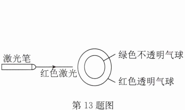 13.在学校庆元旦晚会上,科技小组的同学向大家展示了激光射气球的有趣实验。如图所示,红色透明气球内部还套有一只绿色不透明气球,用红色激光照射透明的红色、不透明绿色两个气球时,下列说法正确的是( )