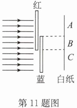 11.(2024·盐城一模)如图,小明在暗室中将红色和蓝色透明玻璃部分重叠放置,在玻璃的右侧放白纸。让太阳光照射到玻璃片上,白纸上A、B、C三个区域呈现的颜色为( )