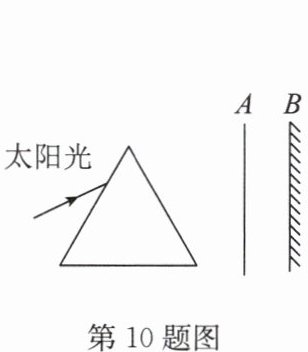 10.如图所示,A为蓝色玻璃,B为白屏。一束太阳光从三棱镜的一边入射,当太阳光经过三棱镜折射后,出射光线再经过A射到B上,则射到B上的光的颜色是( )