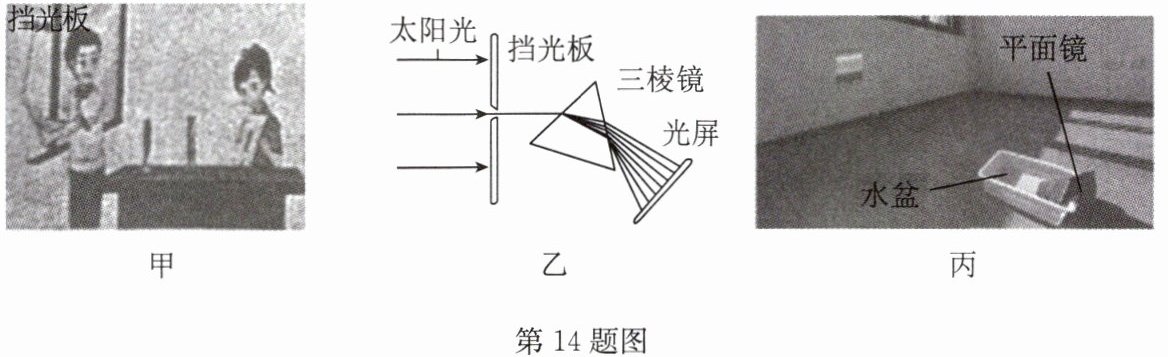 14.(2024·阜宁县期末)如图甲所示,小明让一束太阳光通过挡光板的狭缝照射到三棱镜的一个侧面上,小华用光屏接收从三棱镜的另一侧出射的光线,光路如图乙所示。