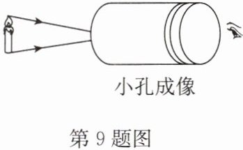 9. 用如图所示装置探究小孔成像的特点,将点燃的蜡烛置于小孔前的适当位置,如果易拉罐底部小孔是三角形,则观察者在半透明塑料薄膜上看到的像是( )