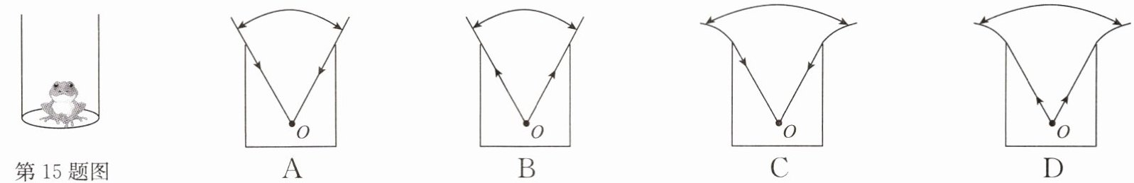 15. 如图,枯井中的青蛙位于井底O点“坐井观天”,下列图示中青蛙通过井口观察范围正确的光路图是( )