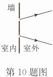 10. 如图所示,室内一盏电灯通过木板隔墙上的两个小洞,透出两条细小光束.请根据这两条光束的方向确定室内电灯的位置.