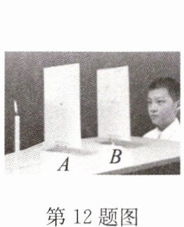 12. 如图所示,小明想通过A、B两张纸片上的小孔看见烛焰,他应将烛焰、两个小孔和人的眼睛调到______上;操作过程中他还发现B纸片上有一个烛焰的像,这个像是______(选填“倒”或“正”)立的,其成因是光在均匀介质中沿______.