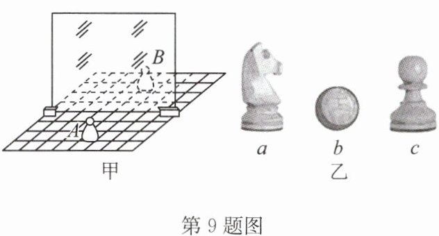 9. 用图甲中的器材探究平面镜成像的特点时,发现不便得到像和物左右之间的关系.为解决这一问题,应选用图乙中的棋子______(选填“a”“b”或“c”)进行实验,分析可得像与物关于镜面______.
