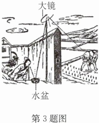 3. 汉代的《淮南万毕术》中记载:“取大镜高悬,置水盆于下,则见四邻矣.”如图装置是世界上有记载的最早的潜望镜,图中的大镜是______镜,插秧人在大镜中成______(选填“虚”或“实”)像,大镜悬挂的高度变大,水盆中所成像的大小______(选填“变大”“变小”或“不变”).