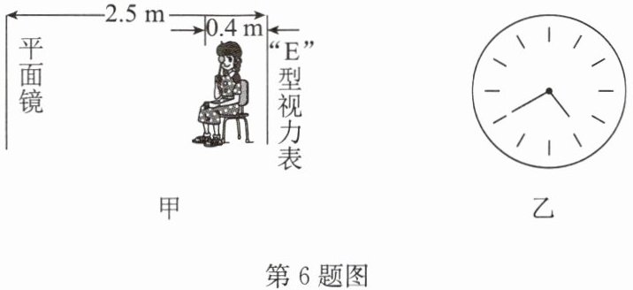 6. 因受场地限制,医生用如图甲所示的方法为小红同学检查视力,“E”型视力表与平面镜相距2.5m,小红观看的是平面镜中“E”型视力表的像. 小红距离“E”型视力表的像有______m远,如果小红站起来以0.5m/s的速度朝平面镜的方向走了3s后,她距离“E”型视力表的像______m远. 小红同学在镜中看到时钟显示的时间如图乙所示,则实际时间是早上______.
