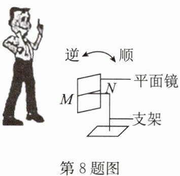 8. 如图所示,竖直放置的平面镜能绕水平轴MN转动,小明站在平面镜正前方,他在镜中成的是______(选填“实”或“虚”)像;小明垂直镜面移动8cm,他与像的距离改变______cm;为了让他站着就能看到镜中脚的像,可以让平面镜绕轴沿______时针方向转动.