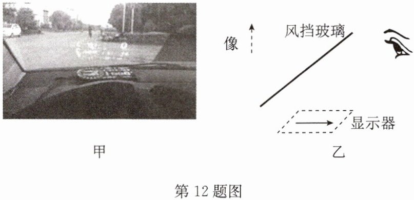 12. 照照买的汽车自带抬头显示器(如图甲所示),简称HUD. 图乙是它的工作原理图,能将水平显示器上的重要行车数据通过前风挡玻璃(看作平面镜)呈现在正前方,确保驾驶的舒适安全,下列说法正确的是( )