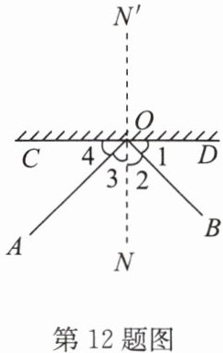 12. 在探究光的反射规律时,老师把一块平面镜CD竖立在讲台上,坐在A点的甲同学通过平面镜看到坐在B点的乙同学(如图)。在这一现象中,光的反射角是( )