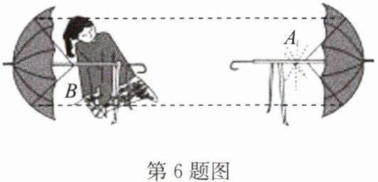 6. 小丽用两把伞做了一个“聚音伞”的实验. 如图,在右边伞的A点挂一块机械手表,当她的耳朵位于B点时听不到声音. 把另一把伞放在左边图示位置后,在B点听到了手表的滴答声. 这个实验表明声音也像光一样可以发生______现象,手表声在两伞之间传播依靠的介质是______.