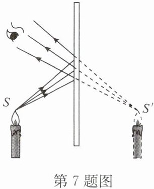 7. 如图所示,小明透过平面镜看到了蜡烛的像,下列有关平面镜成像的描述,正确的是( )