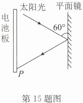 15. 小明在房间中安装了一块太阳能电池板给家里供电。当太阳在电池板后方时,利用一块平面镜将太阳光反射到太阳能电池板上。若某时刻太阳光与平面镜的夹角为60°(如图所示),一束阳光经镜面反射后照射到电池板上的P点,入射角的大小为______°;若将镜面竖直上移,则反射角将______(选填“变大”“变小”或“不变”);若镜面水平左移,则该束光线将照到P点的______(选填“上方”或“下方”)。