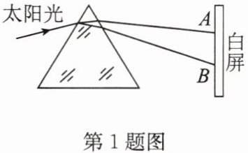 1. 如图所示,一束太阳光通过三棱镜后,被分解成多种颜色的光,在白色光屏上形成一条彩色光带.光屏上A、B是彩色光带边缘的色光,其中B为______光;在白色光屏前放置一块红色玻璃,看到白屏的颜色是______色;如果将温度计放在______(选填“A”或“B”)外侧,一段时间后示数会明显上升.