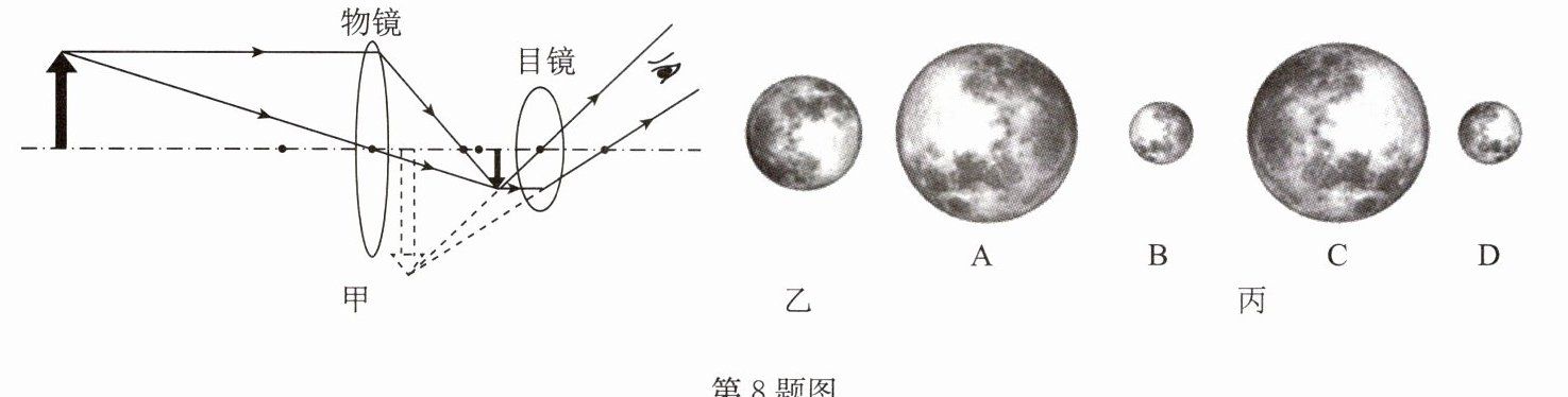 (2)中秋节小滨用肉眼看到的月亮如图乙所示,则他利用望远镜看到的像是图丙中的______。