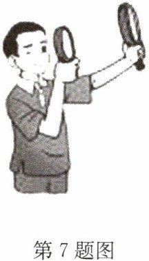 7. 小明取来两个焦距不同的放大镜,一只手握住一个,模拟望远镜,通过两个透镜看前面远处的木棉树,如图所示。调整两个放大镜间的距离,直到看得清楚为止。下列说法正确的是( )