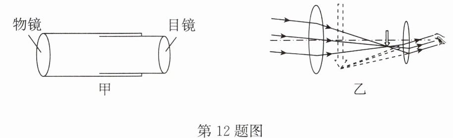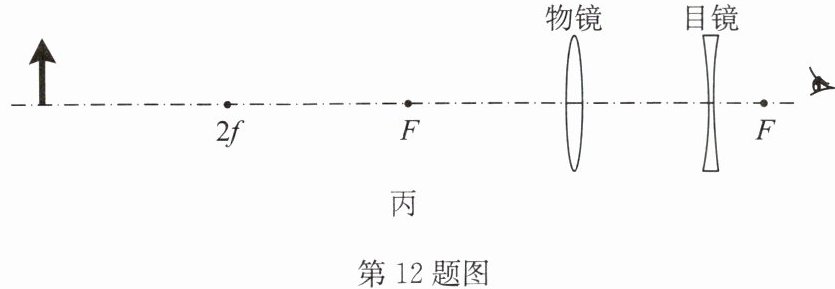 ②为了能通过望远镜看到正立的像,同学们提出了改进思路,原理如图丙。请尝试作出人所看到的物体的像。(图中已知凸透镜的右焦点和凹透镜的右焦点重合,即两透镜间的距离为凸透镜和凹透镜的焦距差)