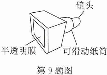 9. 如图所示为创新小组的同学们自制的照相机. 在较暗的教室内,让凸透镜对着明亮的室外,拉动纸筒,在半透明膜上可看到室外实验楼清晰的像,若想在半透明膜上成实验楼更大清晰的像,下列做法正确的是( )