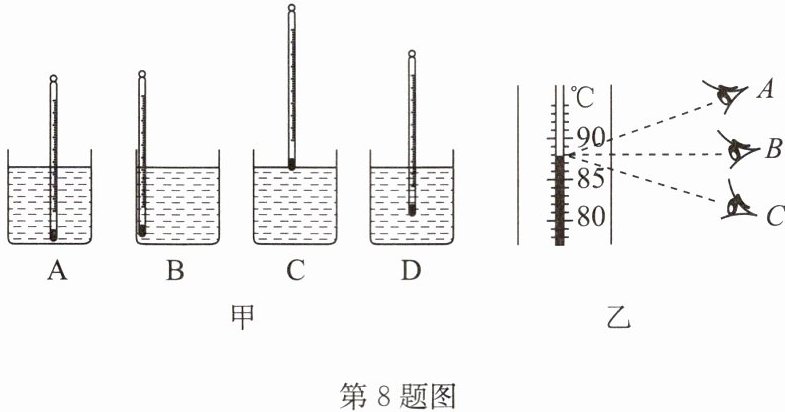 8. 小强在用温度计测烧杯中液体的温度时读取了四次数据,每次读数时温度计的位置如图甲所示,其中正确的是______.某时刻温度计的示数如图乙所示,其中读数方法正确的是______,此时温度计的示数是______℃.