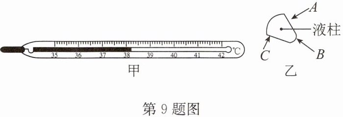 9. 图甲中体温计的示数是______℃,由于水银柱较细难以读数,体温计做成外有凸起的弧形玻璃面,横截面如图乙所示,要看清体温计中液柱的位置应沿______(选填“A”“B”或“C”)方向观察,这是利用凸透镜成______(选填“放大”或“缩小”)的像的原理.