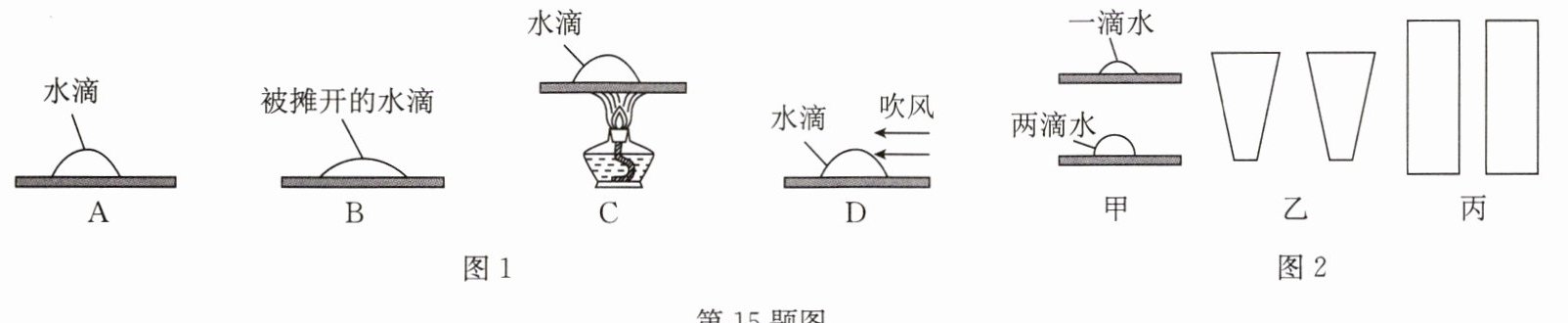 15. 小明同学在4块相同的玻璃板上各滴一滴质量相同的水,进行如图1所示的实验探究,得出水蒸发快慢与水的温度、水的表面积和水面上方空气流动快慢有关.